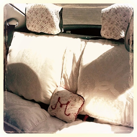 My style is also a bit of French shabby chic. Very much like my own fashion style, I love mixing textiles, and playing with different patterns that work cohesively. Having the passenger seat offset the driver's cushions was also intentionally done to create visual interest. The "heart pillow" use to be a a bag that carried my knitting needles.
